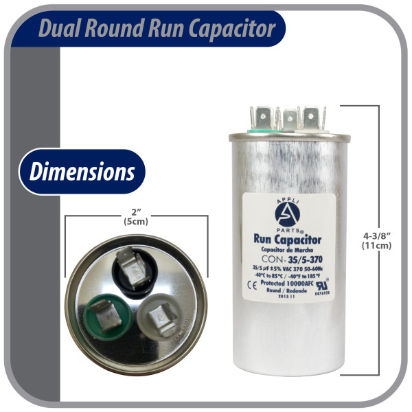 Appli Parts Dual Run Capacitor for ac 35+5 Mfd uF (microfarads) 370VAC CBB65 Round Universal fit for hvac and other applications UL E476928 2in Wide 4-3/8in Height CON-35/5-370-R