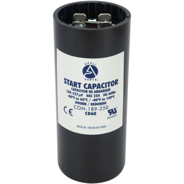 Appli Parts CON-189-250 Motor Start Capacitor 189-227 MFD uF, 250 VAC. Universal for Electric Motor Applications, 1.44 in Wide, 3.38 in Height