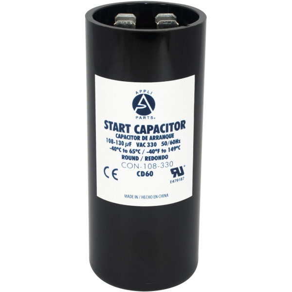 Appli Parts CON-108-330 Motor Start Capacitor 108-130 MFD uF, 330 VAC. Universal for Electric Motor Applications, 1.44 in Wide, 3.38 in Height
