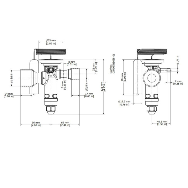Danfoss 067N3164 23TR Thermostatic expansion valve, TGE, R410A, 7/8x1-3/8 in Solder, ODF, 1/4 in Externally equalized, Bi-flow, -40 to 50 F replaces 067N3184