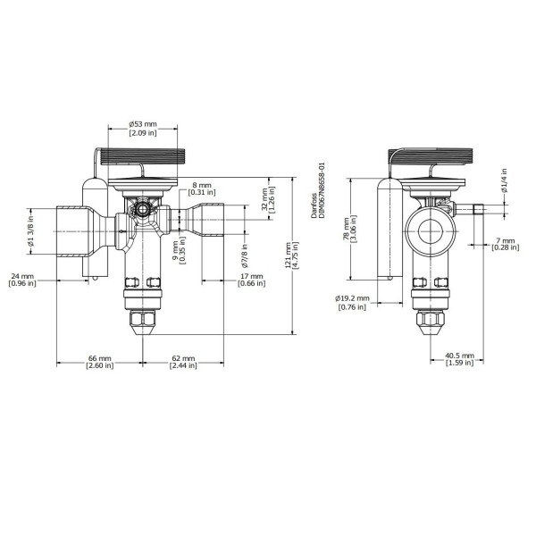 Danfoss 067N2034 18TR Valvula de Expansion Termostatica, TGE, R22,R407C, 7/8x1-3/8 pulg Soldable, ODF, 1/4 pulg Ecualizacion Externa, Bi-flow, -25 a 10 C, remplaza 067N2014